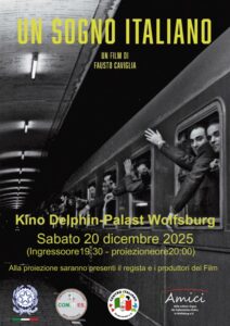 Sabato 20/12 – ore 19.30 – Film in lingua italiana con sottotitoli in tedesco: “Un sogno italiano” (Regia: Fausto Caviglia, 80 min.) – In occasione del 70° anniversario del Contratto di Manodopera Italia-Germania, firmato il 20 dicembre 1955.